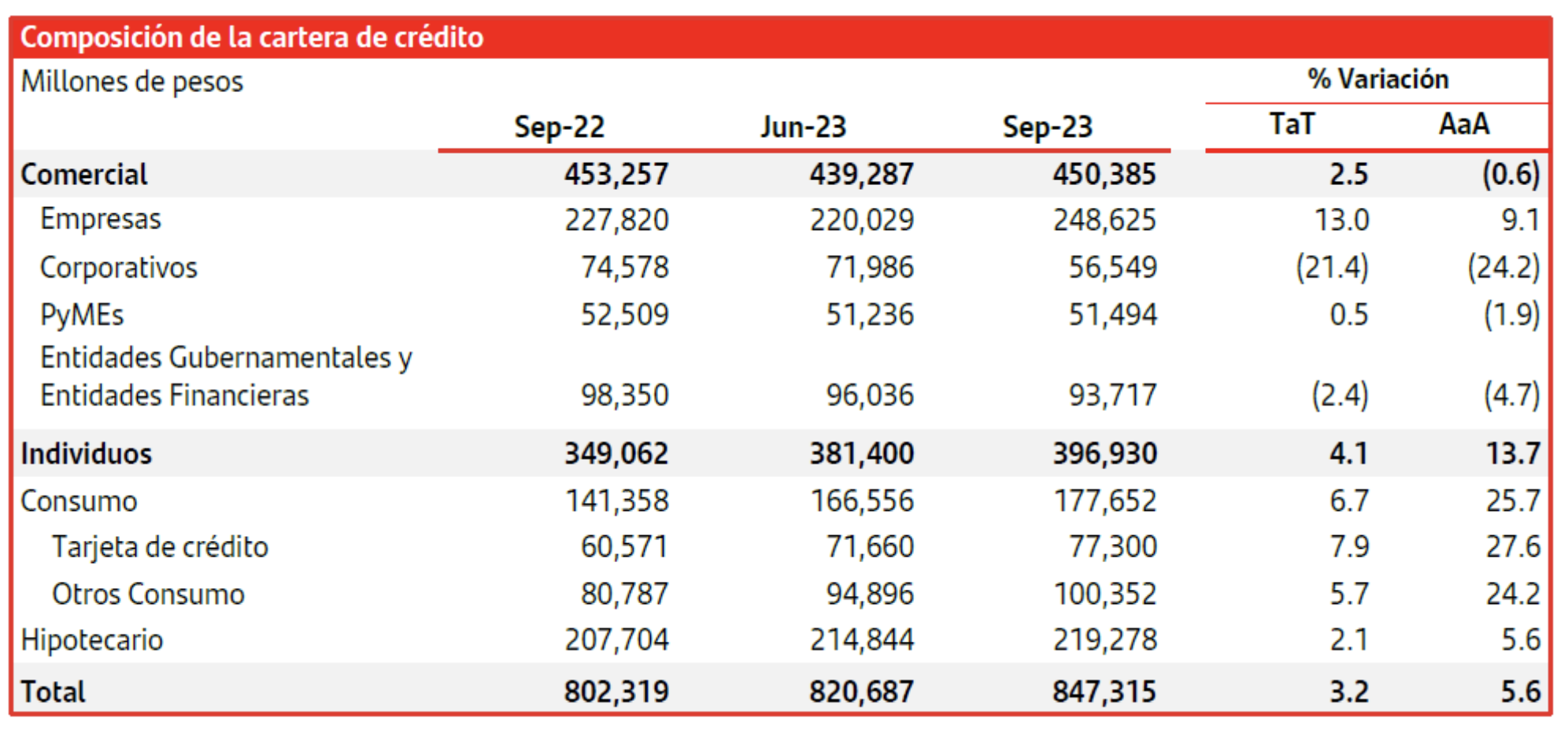 Al 3T23, la cartera de crédito total registró un crecimiento interanual de 5.6% o $847,315 millones, destacando los crecimientos interanuales de 27.6% de Tarjetas de Crédito; 24.2% de Otros Consumo; 9.1% de Empresas y 5.6% de Hipotecas.