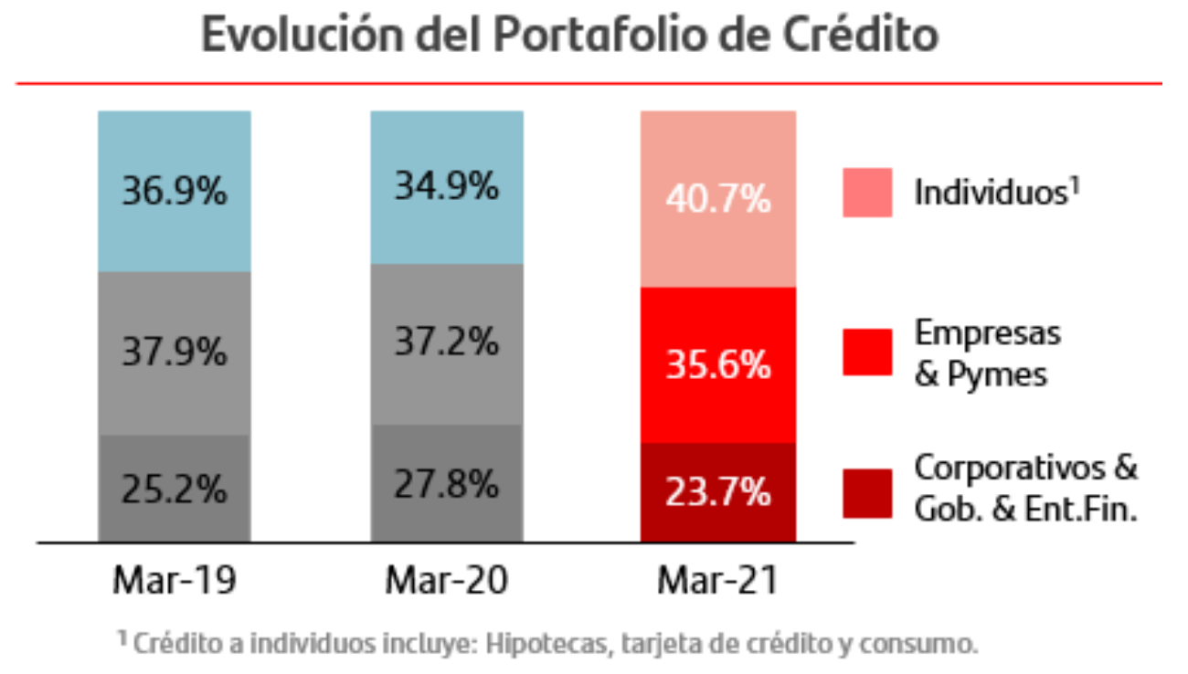 Al 1T21, la cartera de crédito total de Santander México disminuyó 8.0% respecto al mismo trimestre de 2020, donde se destacan los crecimientos interanuales del 14.2% de Hipotecas, 7.2% de Consumo y 4.8% de Entidades Gubernamentales y Entidades Financieras.