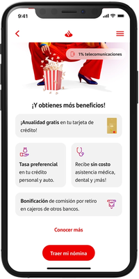 Recibir tu nómina en Santander hace crecer tu quincena con beneficios y descuentos exclusivos como cashback, Asistencias, Seguros, Créditos y más.