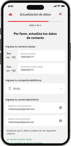 Ingresa tu número de celular, correo electrónico y compañía telefónica.