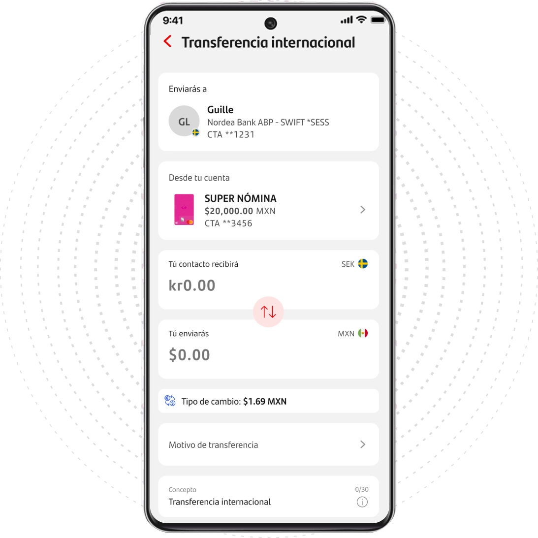 Es el nuevo servicio con el que podrás realizar transferencias internacionales al extranjero en 7 divisas diferentes (euro, dólar canadiense, yen japonés, dólar americano, libra esterlina, franco suizo, corona sueca ) con cargo a tu cuenta Santander en pesos desde la app Santander.